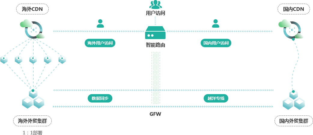 在海外和国内同时部署服务集群,专线链接,智能路由海外及国内用户